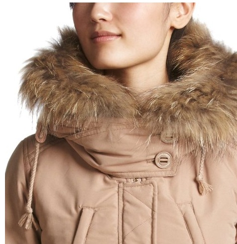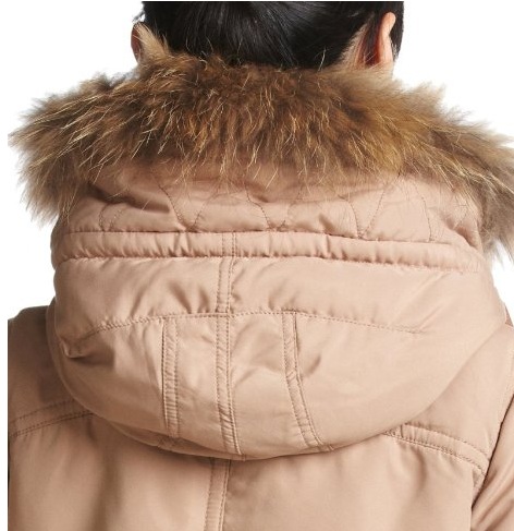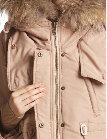 襟もとのリアルファー、ジップ&ボタンの